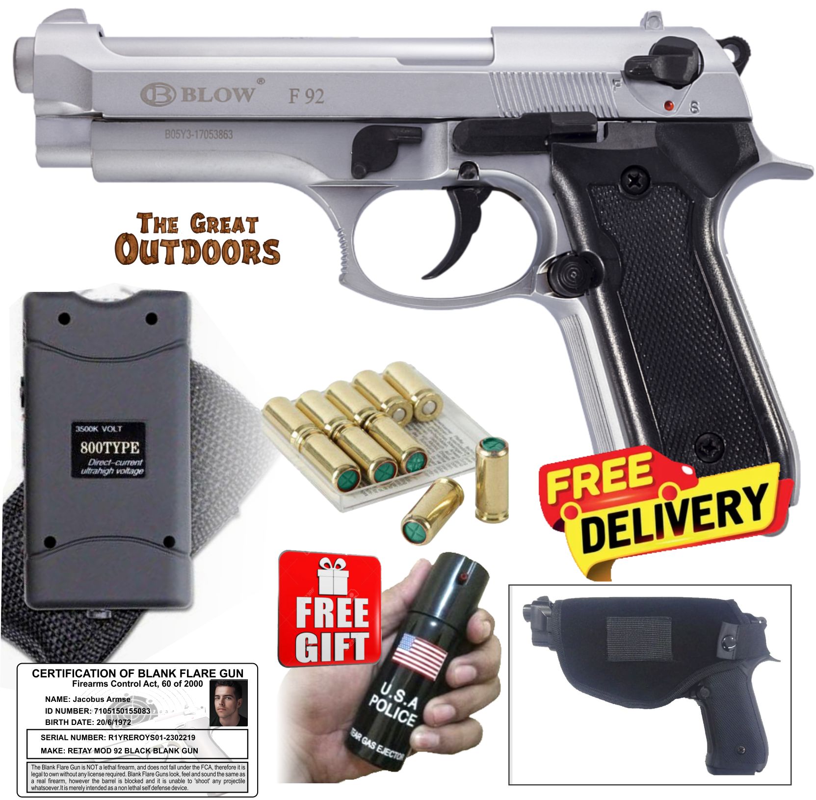 Blow F92 Matt Silver Beretta Blank Gun with 10 Blanks, Holster and 3,8 Mil Volts Stun Gun