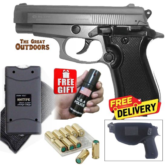 INCLUDES: 10 Blank Rounds, Holster and 3.8 Million Volt Rechargeable Stun Gun with pouch and built-in torch. The Stun Gun sends electrical shocks into the perpetrators body, hijacking their nervous system and causing muscles to lock up as well as extreme pain.