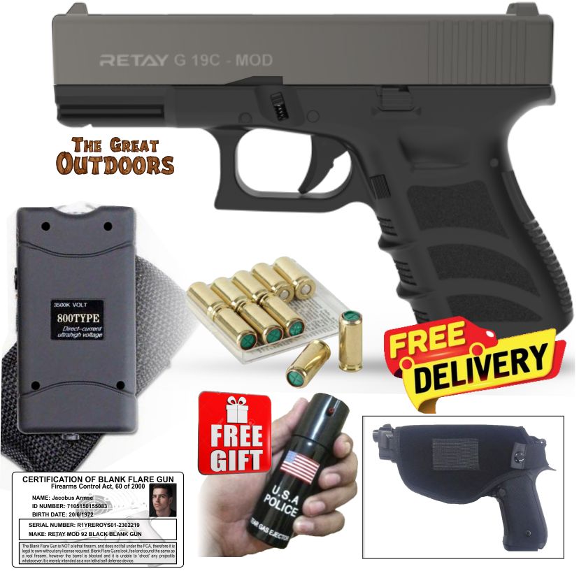 Kuzey GN19 Black and Grey Self Defense Pepper Blank Gun with 10 Blank Rounds, Holster and 3,8 Mil Volts Stun GunKuzey GN19 Black and Grey Self Defense Pepper Blank Gun with 10 Blank Rounds, Holster and 3,8 Mil Volts Stun Gun
