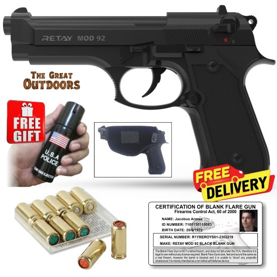 Retay MOD 92 Black Blank Gun with 10 Blank Rounds, 3 Pepper Rounds and HolsterRetay MOD 92 Black Blank Gun with 10 Blank Rounds, 3 Pepper Rounds and Holster